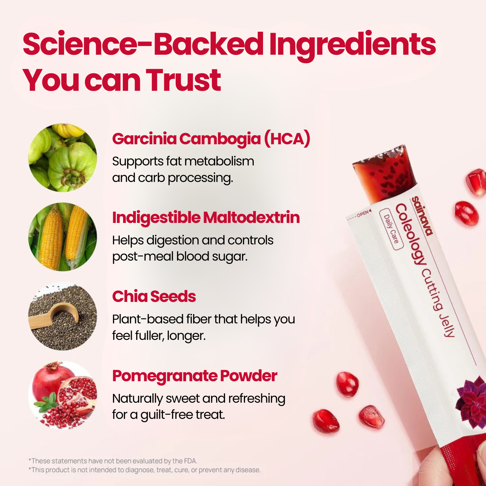 Sainava™ isn’t another quick-fix — it’s built on proven ingredients and real nutrition. Each jelly stick blends Garcinia Cambogia, Chia Seeds, Collagen, Hyaluronic Acid, and Pomegranate extract to help reduce bloating, control cravings, support healthy digestion, and boost natural skin glow — all without pills, crashes, or side effects.