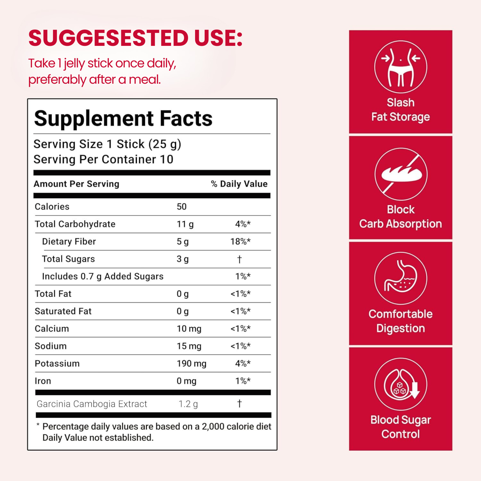Powered by Garcinia Cambogia, Pomegranate & Chia Seeds, plus Collagen + Hyaluronic Acid, it supports gut health, eases bloating, and delivers visible glow — all in one simple daily stick.